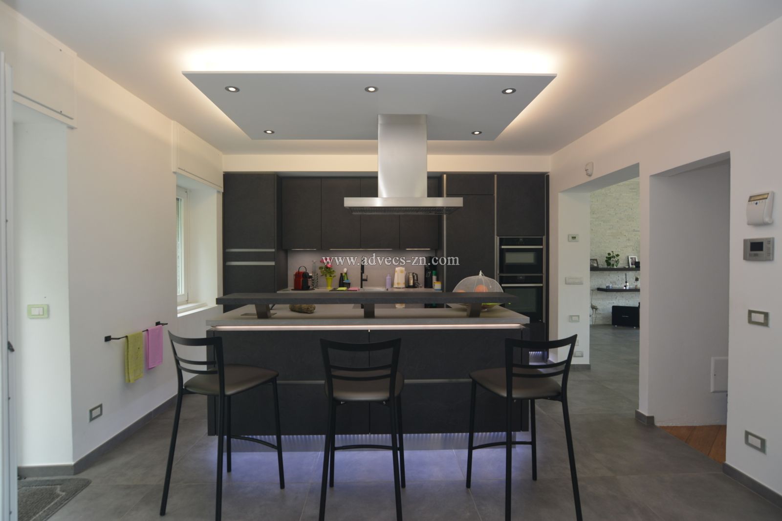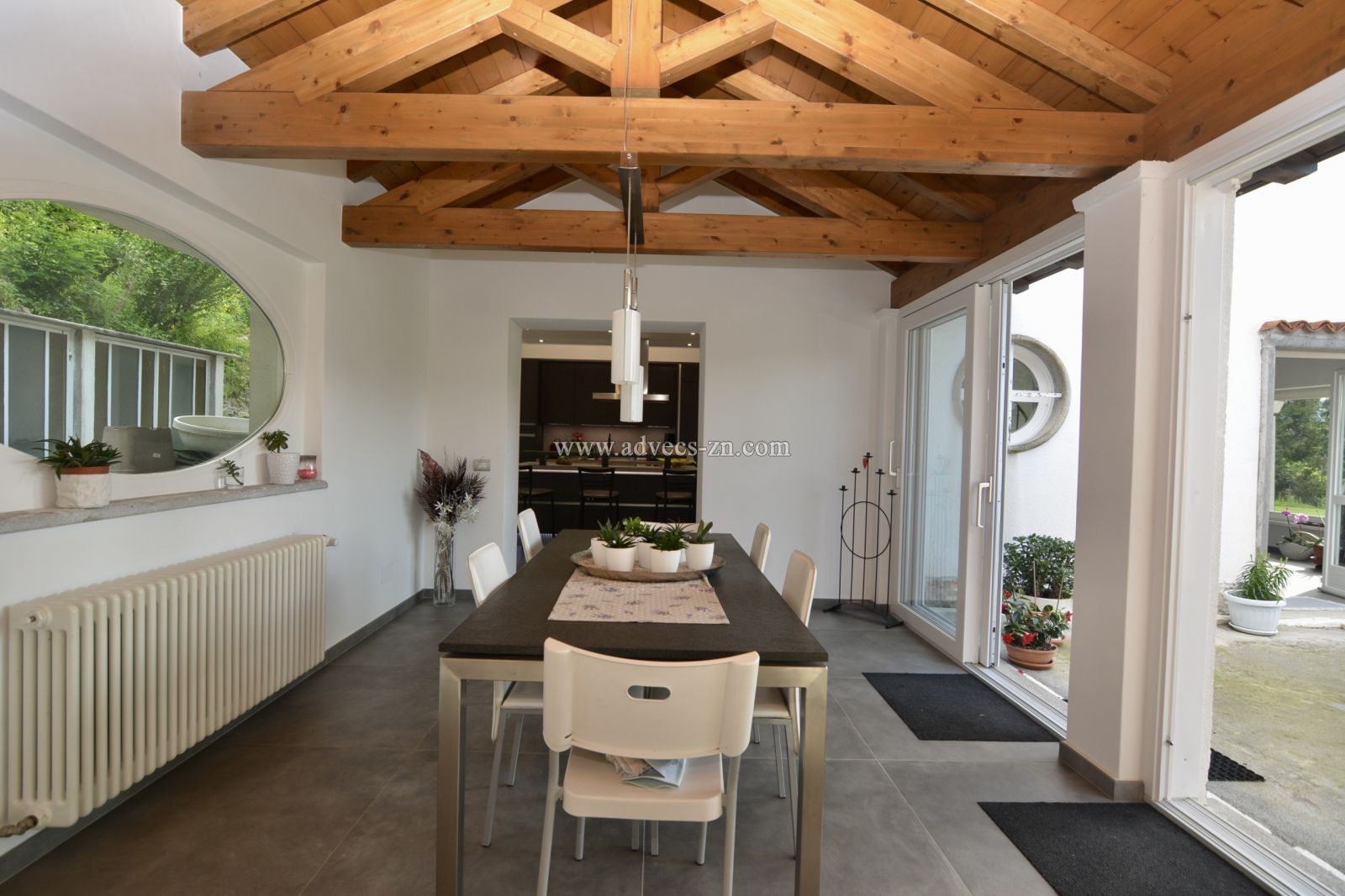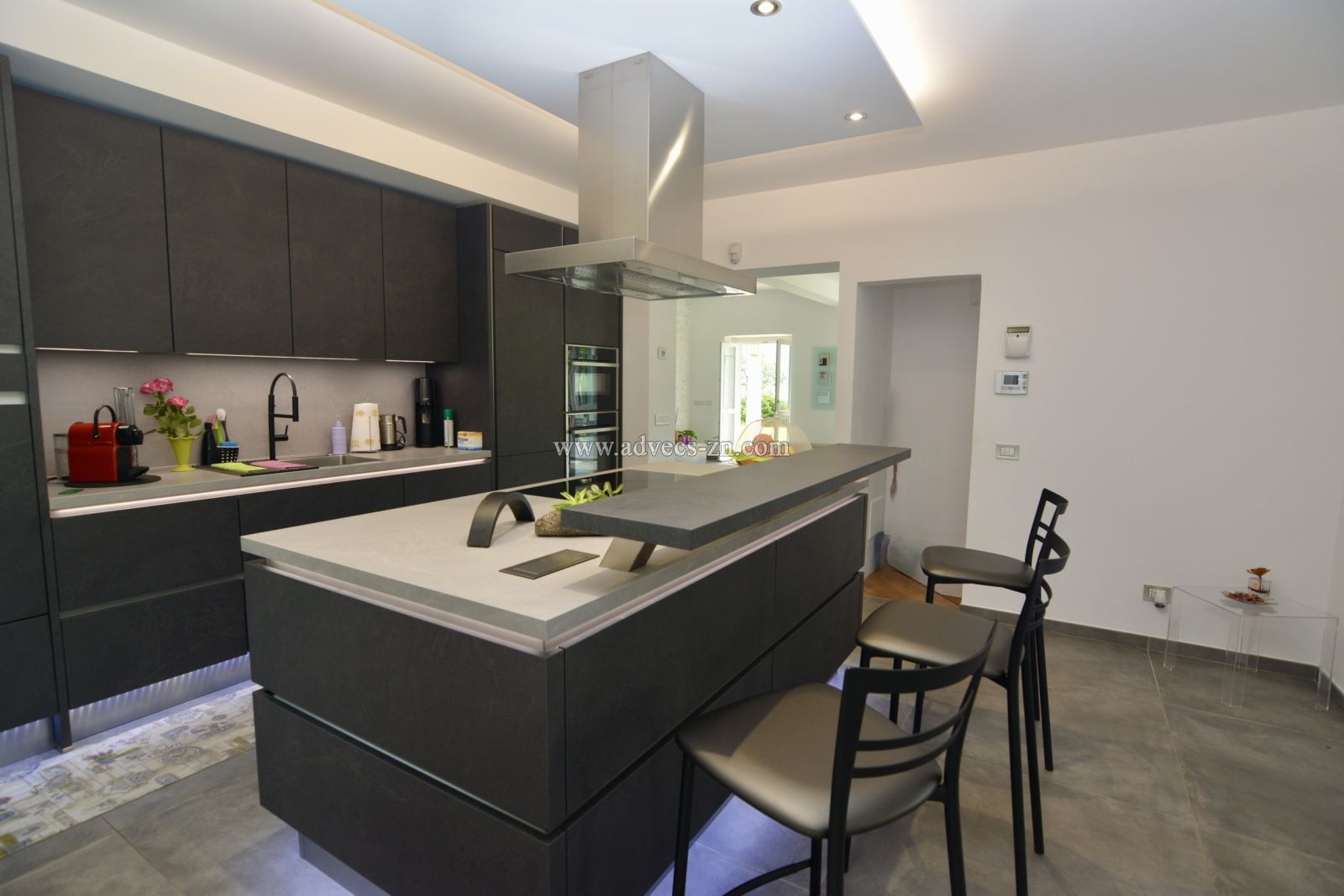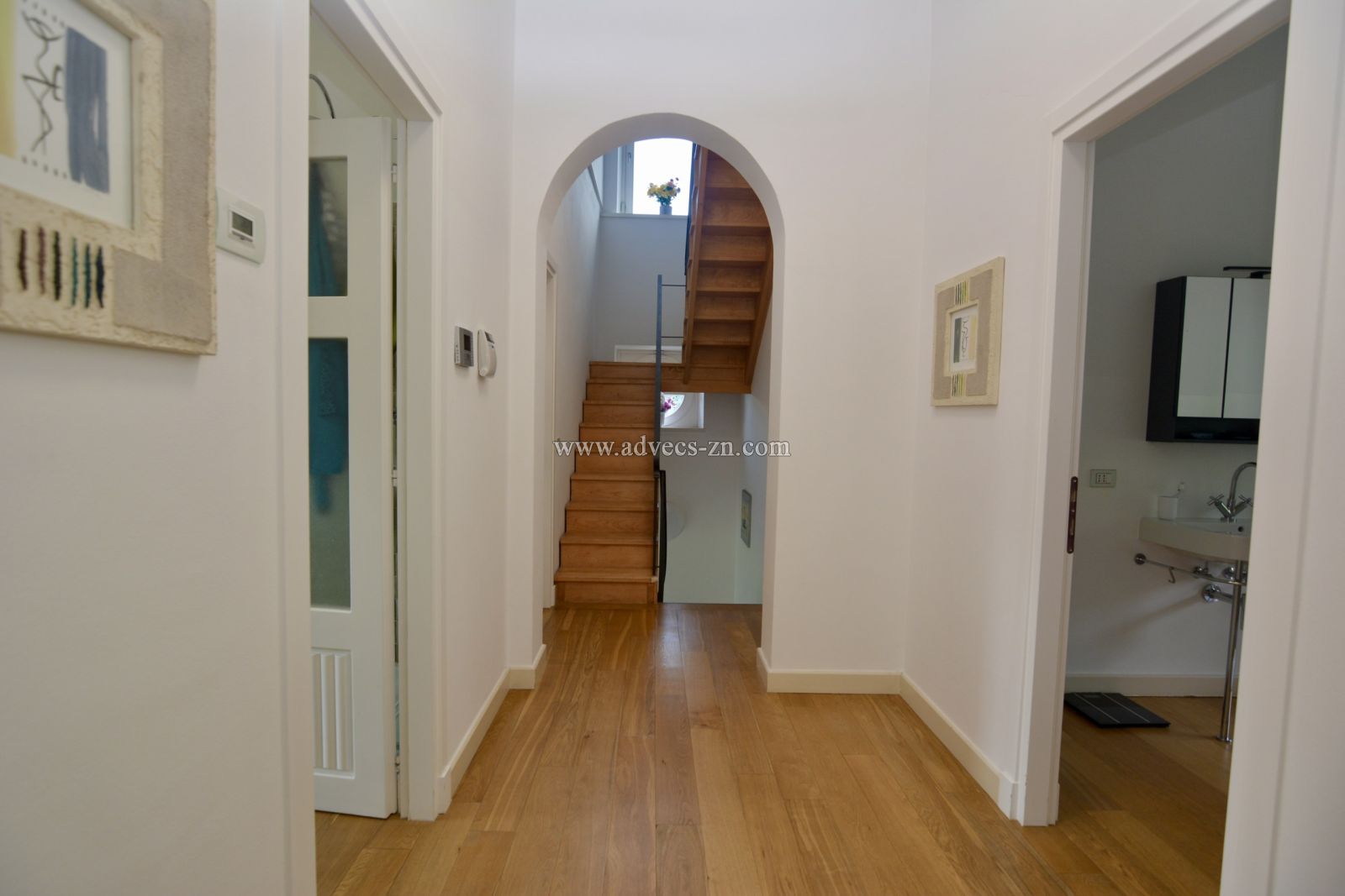 Первый этаж - большая и светлая гостиная с выходом в сад, кухня с островом, столовая с двойным выходом: один выход в сад, где находится обеденная зона на открытом воздухе с удобной зоной отдыха, зона барбекю и небольшой бассейн-джакузи; другой выход ведет в удобную таверну, которую можно разделить с гостями в холодное время года. На этом же этаже находится комната, удобно используемая в качестве гардеробной, кабинет, спальня и служебная ванная комната.
